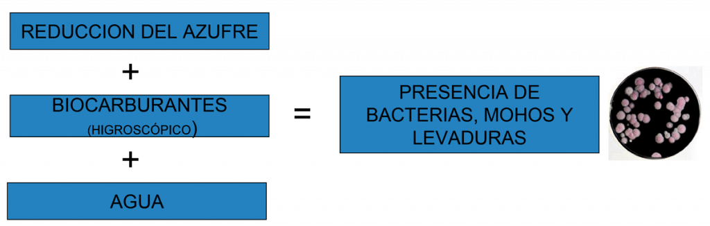 Al incorporar biodiesel suministramos materia orgánica (nutrientes) que favorece la aparición y el medio ideal para el desarrollo de microorganismos.