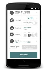 • Si no lo ha detectado tu bluetooth, ESCOJE SURTIDOR y pulsa el BOTÓN REPOSTAR. Verás en la pantalla de tu móvil el importe por tí PRECONFIGURADO y el tipo de combustible, sin necesidad de seleccionarlo cada vez.